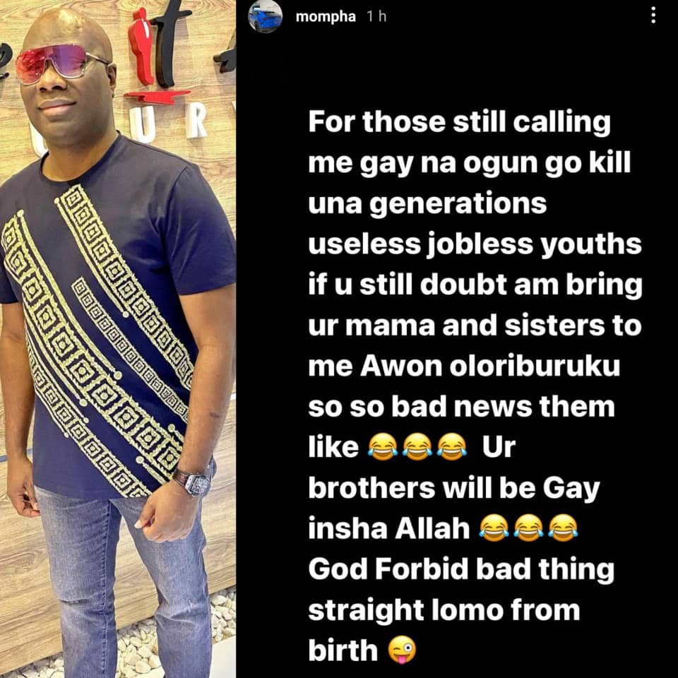 Businessman, Mompha, has taken to his Instatories to attack people who are still insisting he is gay.